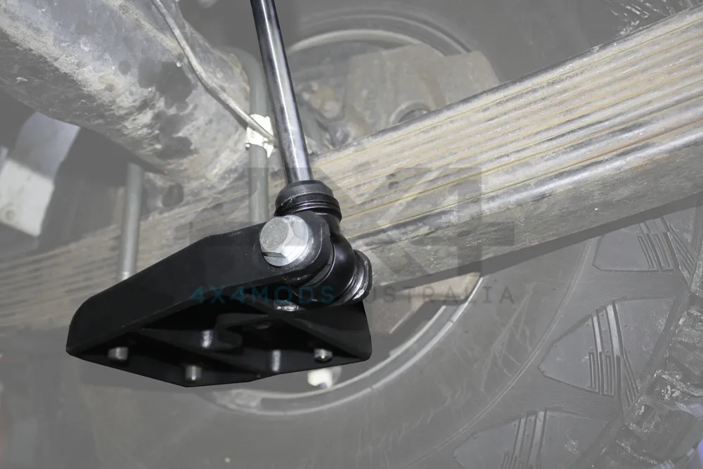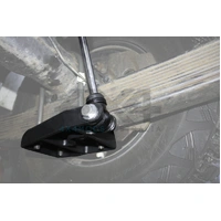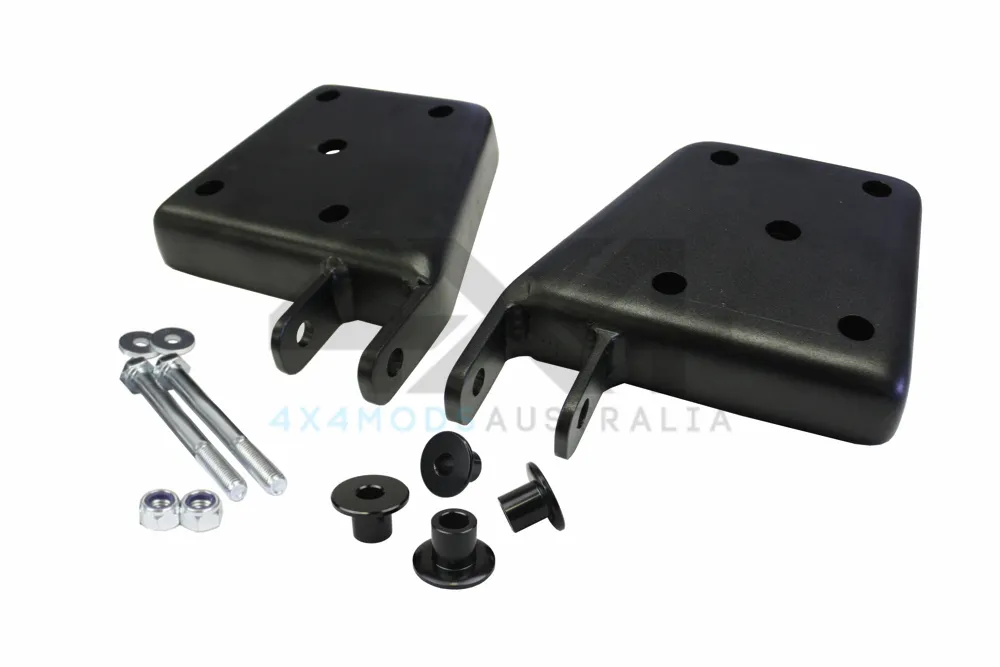 Unlike other products on the market which are a bolt in pin to eye conversion on the original leaf mount, these will not raise the mounting point of the shock pin, but rather lower the mount allowing a longer shock absorber to be used, gaining shock absorber length and increasing off road performance. It is manufactured using a combination of 6 / 8mm plate and re-enforced with welded gussets.