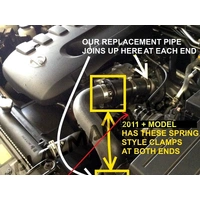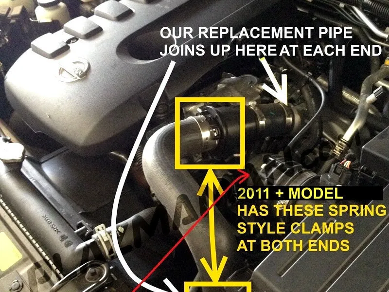 This hot side piping kit is to suit the late model Nissan Navara/Pathfinder 2.5L D40 2011 Onwards (Spring Clip Ends - Not hose clamps).This piping kit replaces the factory rubber hose that runs from the primary intercooler inlet pipe, to the cast aluminium turbocharger compressor housing outlet elbow.