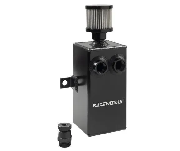 An oil catch can or breather tank is an essential step in removing PCV oil before it enters the combustion chamber, and must be baffled while providing unrestricted flow to maintain efficiency and prevent intake carbon build-up. Raceworks Catch Cans have been crafted to meet the most extreme street and track conditions, and are perfectly robot welded from 5052 aluminium. Every unit is presented in a tough, high polished finish, with precision machined AN fittings for leak-free installation. A tapered banjo-style drain plug is fitted to each unit for spill-free oil retrieval, and can be completely replaced with any suitable AN or barb style adapter if a permanent oil-return solution is required.
