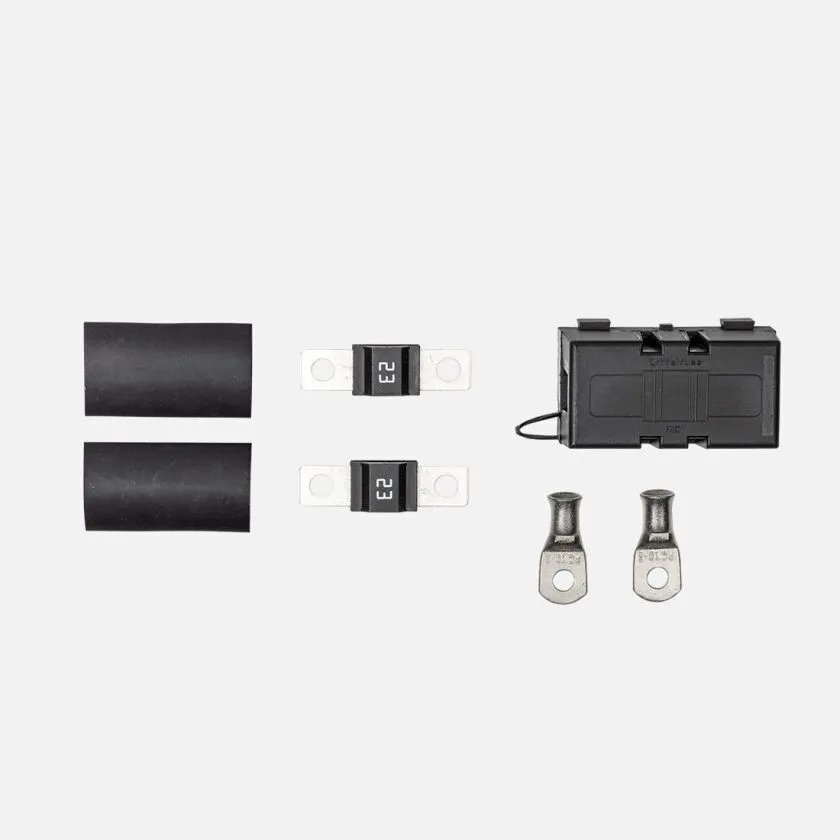 The 23A and 30A fuse kit comes with (1) fuse holder with fasteners, (2) 23A fuses, cable lugs, adhesive heat shrink and a detailed instruction sheet.