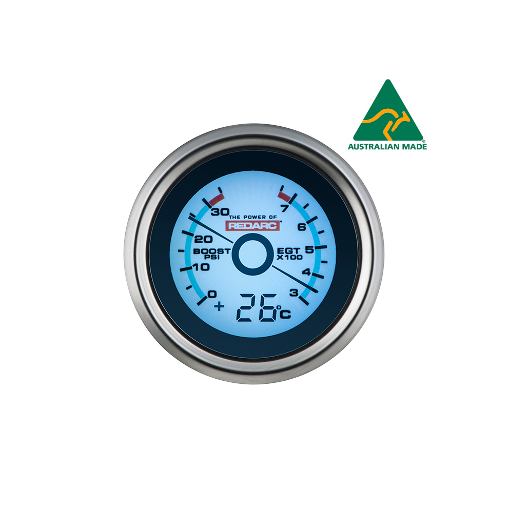 The REDARC 52mm EGT & boost pressure gauge is a must for your diesel turbocharged vehicle.