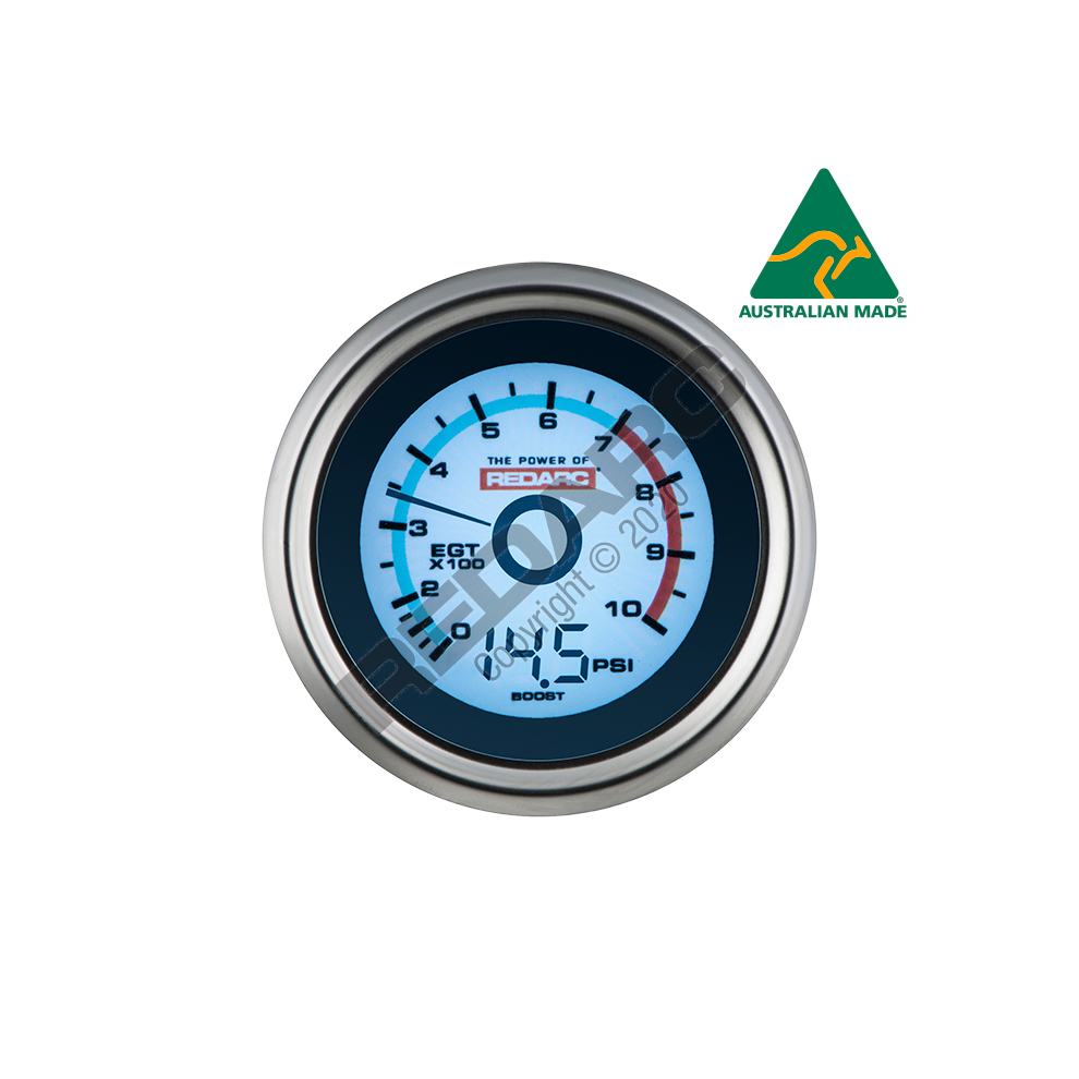 The REDARC 52mm EGT & boost pressure gauge is a must for your diesel turbocharged vehicle.