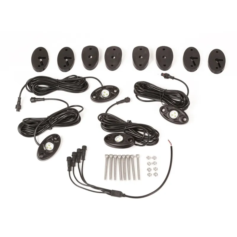 Rugged Ridge LED Rock Lights is a complete package to equip your Jeep or off-road vehicle so that you can see and be seen when piloting the trails after dark. Designed with the off-roader in mind, the LED Rock Lights utilize waterproof aluminum LED housings for safe and reliable performance in all weather conditions. Each of the four white LED Rock Light circuits is fitted with weather-resistant connectors and combines using a sealed splitter for a clean installation and efficient operation. The kit includes four flat mounts and 4 curved mounts, allowing you to mount the LED?s in a variety of locations depending on your application for greater versatility. Includes hardware and wiring instructions (Complete Kit w/ switch, wiring and relay included - Part number 11232.40)