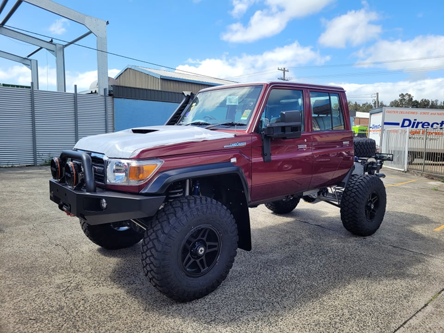 To compliment the required guard trimming and new Superior Flares, all 5” Lift Outback Tourer Kits come with a Uneek Single Hoop Bullbar, manufactured specifically for this kit. Wider than normal off the shelf Bullbars for 79 Series, and with a shortened end wing profile for maximum wheel clearance, this bar sets your build apart from the rest. This Uneek Single Hoop Superior Bar also features customised H4 Headlight Relocation into the bar to meet ADR Requirements.