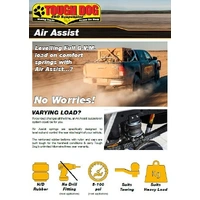 If your load changes all the time, an Air Assist suspension system could be for you.  Air Assist springs are specifically designed to level out and control the rear ride height of your vehicle.The high pressure polyurethane construction inserts are built tough for the harshest conditions & carry Tough Dog’s unlimited kilometre three year warranty.