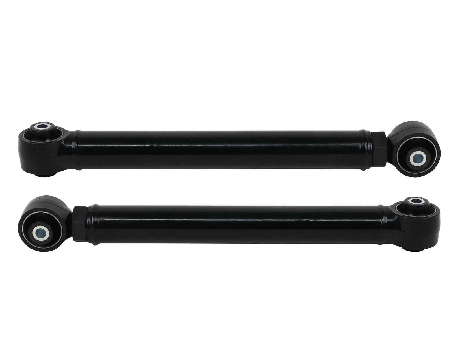 Heavy duty turnbuckle adjustable trailing arms provides incremental on car adjustability of differential pinion angle. This allows you to dial in more or less traction under heavy acceleration.