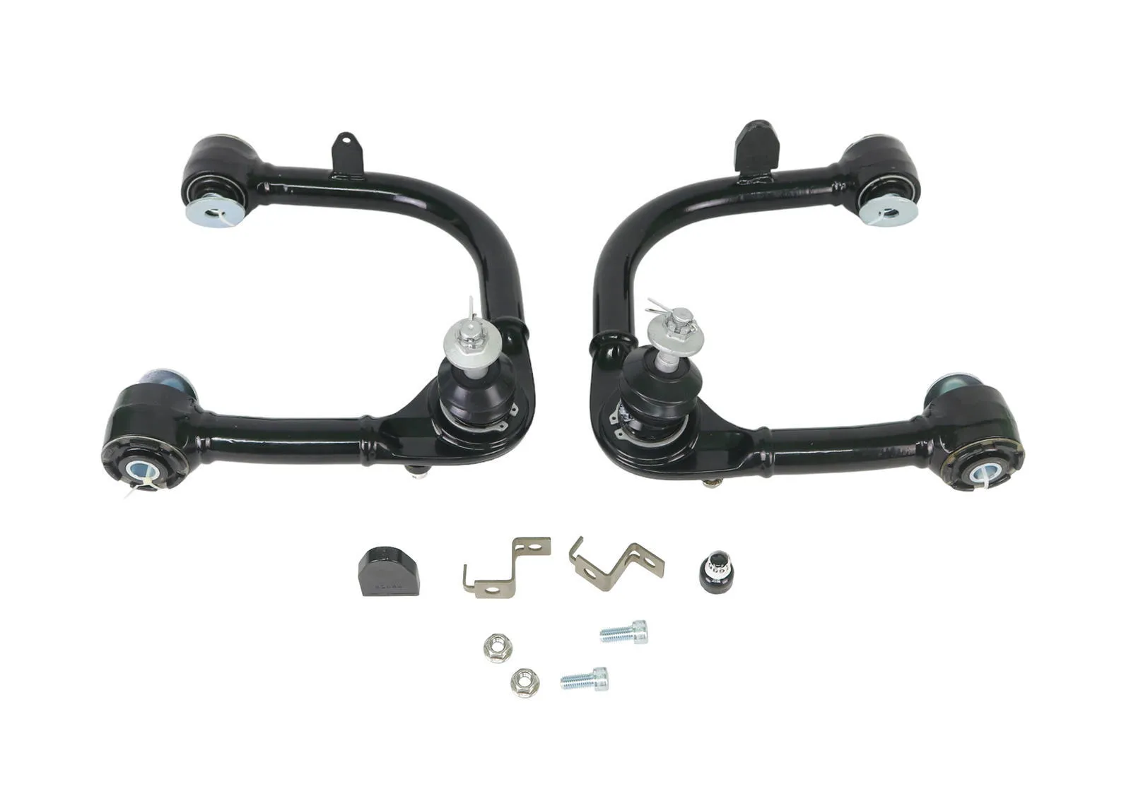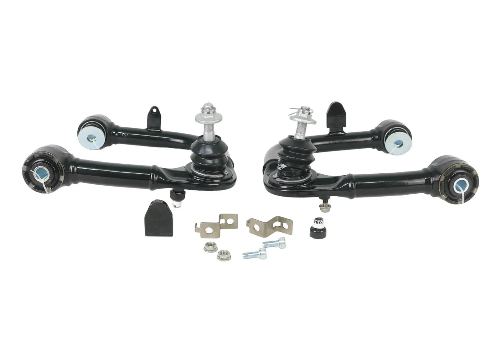A short fall of the modern day IFS 4wd is the adjustment range provided for successful wheel alignments, this becomes even more of an issue when the vehicle is lifted by more than 1 inch. Not only does the vehicle run into camber and caster issues, but ball joint articulation and clearance issues to the coil over strut at ride and droop height. The new Whiteline offset UCA (Upper Control Arm) is an all-in-one solution for any vehicle that has been lifted between 30mm and 70mm. Providing an increase between +2.0 degrees of caster and up to 1.5 degrees of negative camber increase (figures quoted are based off an approximate 50mm/ 2 inch) along with greater clearance to the coil over strut and more articulation of the arm by virtue of new maintenance free GIIRO bushing technology.