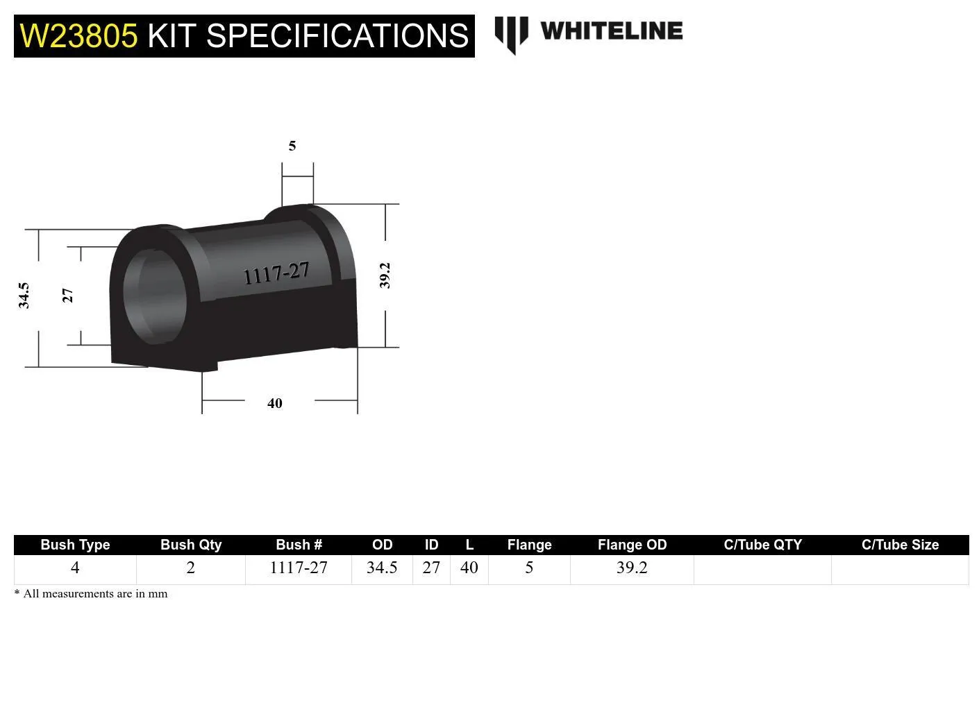 Designed to fit a 27mm sway bar. Whiteline's sway bar mount bushings not only boasts the latest in bushing material technology but feature a knurled ID specifically designed to retain grease. Backed up by a Limited Lifetime Warranty. Whiteline bushings are made from the latest highest quality synthetic elastomer and designed to synchronize your suspension system for optimal safety, handling, performance, ride quality, longevity and reduced maintenance. They are the most positive link between your vehicles body, springs, struts, arms, bars and shocks.