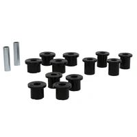 All in one leaf spring bushing service kit covering front and rear eyes of the leaf plus shackle bushings. High kilometres and heavy load carrying causes excessive wear on rubber bushings. Whiteline's signature black bushings are made tough and offer outstanding abrasion resistance, high load bearing capability (4WD's, utes and towing), flexibility, increased tensile strength and chemical resistance to oil, grease, ozone and weathering.
