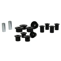 All in one leaf spring bushing service kit covering front and rear eyes of the leaf plus shackle bushings. High kilometres and heavy load carrying causes excessive wear on rubber bushings. Whiteline's signature black bushings are made tough and offer outstanding abrasion resistance, high load bearing capability (4WD's, utes and towing), flexibility, increased tensile strength and chemical resistance to oil, grease, ozone and weathering.