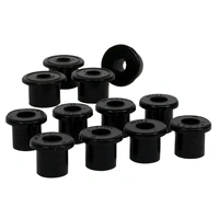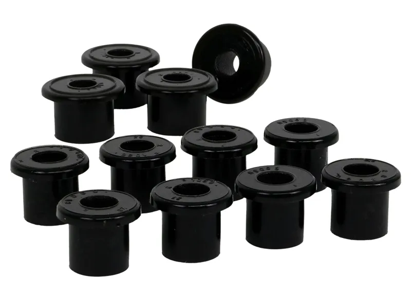 All in one leaf spring bushing service kit covering front and rear eyes of the leaf plus shackle bushings. High kilometres and heavy load carrying causes excessive wear on rubber bushings. Whiteline's signature black bushings are made tough and offer outstanding abrasion resistance, high load bearing capability (4WD's, utes and towing), flexibility, increased tensile strength and chemical resistance to oil, grease, ozone and weathering.