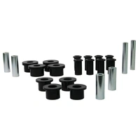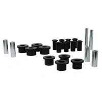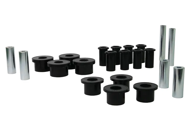 All in one leaf spring bushing service kit covering front and rear eyes of the leaf plus shackle bushings. High kilometres and heavy load carrying causes excessive wear on rubber bushings. Whiteline's signature black bushings are made tough and offer outstanding abrasion resistance, high load bearing capability (4WD's, utes and towing), flexibility, increased tensile strength and chemical resistance to oil, grease, ozone and weathering.