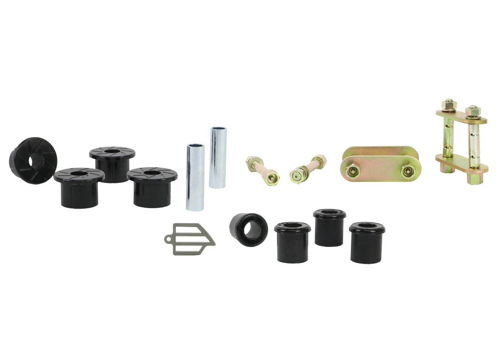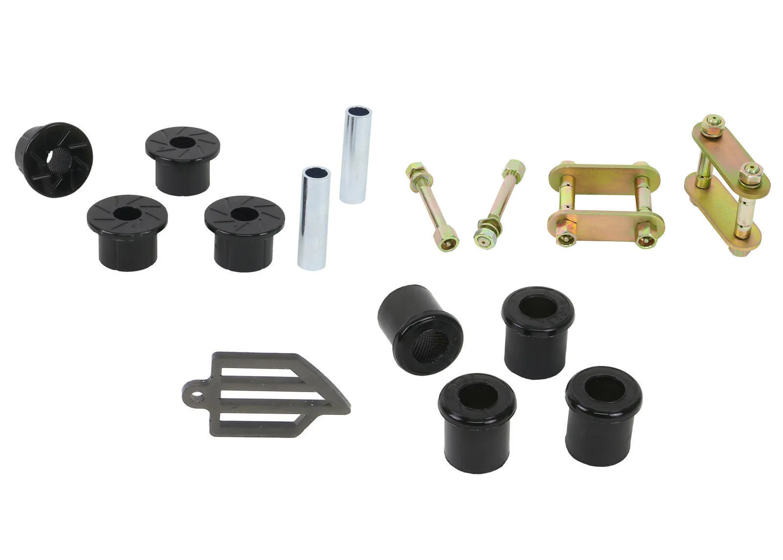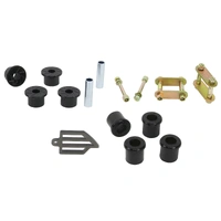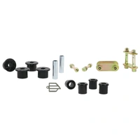 The Shackles and Fixed Pins are often overlooked when upgrading the suspension of a 4WD. Original shackles and fixed pins corrode and destroy the bushings and it is the leaf spring bushings that stabilise the movement of the rear axle. Worn or inferior bushes in this area will cause the solid rear axle to move and impart rear end passive steer to the vehicle leading to the vehicle 'wandering' all over the road and be unstable under heavy braking. This can be especially noticeable carrying a load or towing a boat or caravan. By fitting the complete package of Whiteline Greasable Shackles, Fixed Pins and Bushing kit the rear end of any 4WD will handle just about anything that is throw at it!