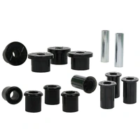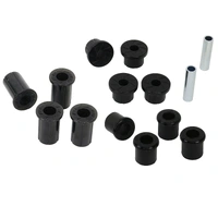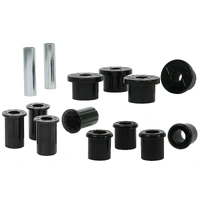 All in one leaf spring bushing service kit covering front and rear eyes of the leaf plus shackle bushings. High kilometres and heavy load carrying causes excessive wear on rubber bushings. Whiteline's signature black bushings are made tough and offer outstanding abrasion resistance, high load bearing capability (4WD's, utes and towing), flexibility, increased tensile strength and chemical resistance to oil, grease, ozone and weathering.