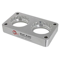 Silver Bullet throttle body spacers create turbulence in the air flow at the point just prior entry into the engine increasing horsepower, torque and improving throttle response and fuel efficiency. Silver Bullet throttle body spacers are constructed out of durable 6061-T6 billet aluminum and using a unique serrated/helix entry to create turbulence at the manifold while eliminating the annoying whistle found in other helix only throttle spacers.
