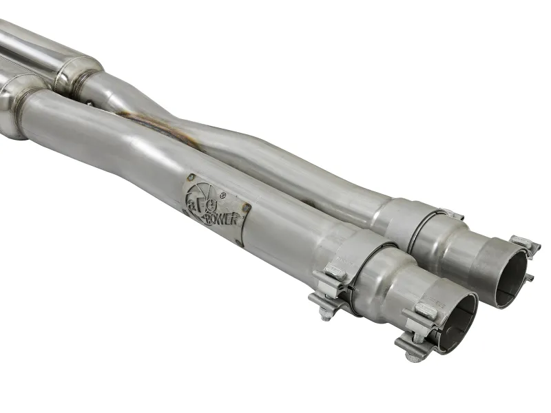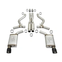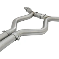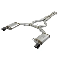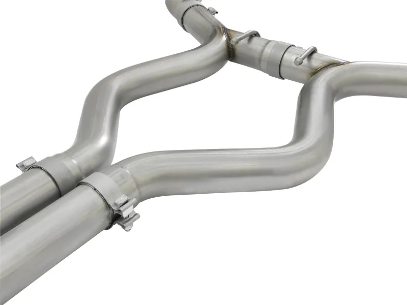 This cat-back exhaust system is constructed of 2-1/2 IN mandrel-bent 304 stainless steel tubing for maximum strength and durability. Finishing off this exhaust system are dual 4-1/2 IN diameter black 304 stainless steel clamp-on exhaust tips. The tips features a laser etched aFe POWER logo for a unique style. This system features high-flow 409 stainless steel polished mufflers, producing an aggressive sound. Muffler finish may vary. This system produces a deep sound unleashing all available horsepower and torque. Designed to equalize and evenly distribute exhaust pulses reducing drone, improving sound. Utilizing factory style flanges and hangers this system is a direct bolt-on system, which requires no cutting or modifications for a hassle-free installation. A mitered merge x-pipe is used to balance and evenly distribute exhaust pulses traveling through the exhaust system, minimizing exhaust drone and maximizing scavenging. State-of-the-art computer-aided design technology is utilized for precise vehicle fitment. 100% MIG-Welded for race-proven strength and durability.