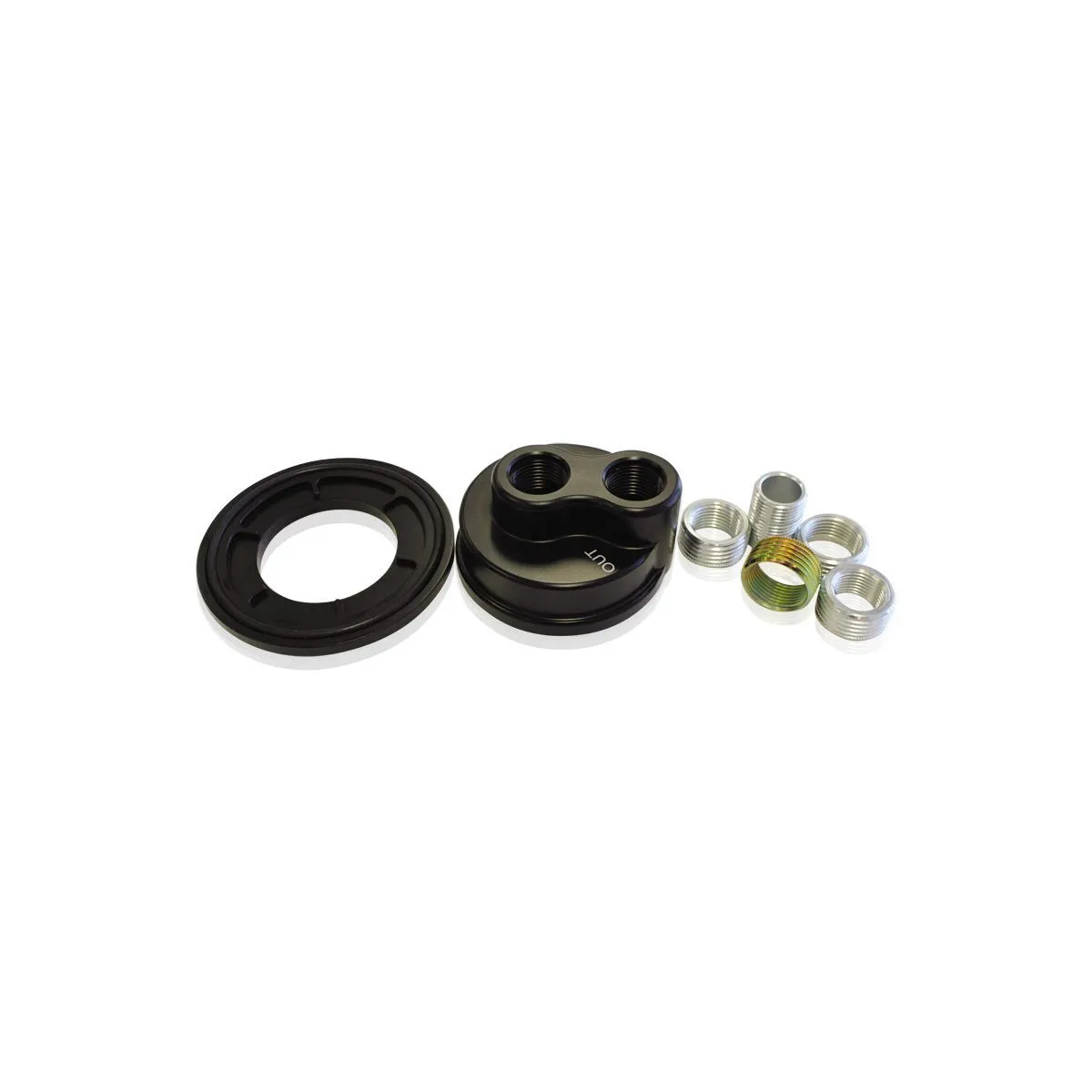 To help move your oil filter to a new location or to add a new external oil cooler to the engine, Aeroflow Performance have this billet remote block adapter. This spin on adapter converts the oil filter landing on the engine block to an oil passage for use with a remote oil cooler and/or a remote oil filter. The main body is made from billet 6061 aluminium, then anodised black for great looks and corrosion resistance. Featuring two -8ORB ports that are labelled inlet and outlet allow you to run custom plumbing braided or rubber hoses. Included in this remote block adapters are various universal thread adapters to suit a wide variety of engines.