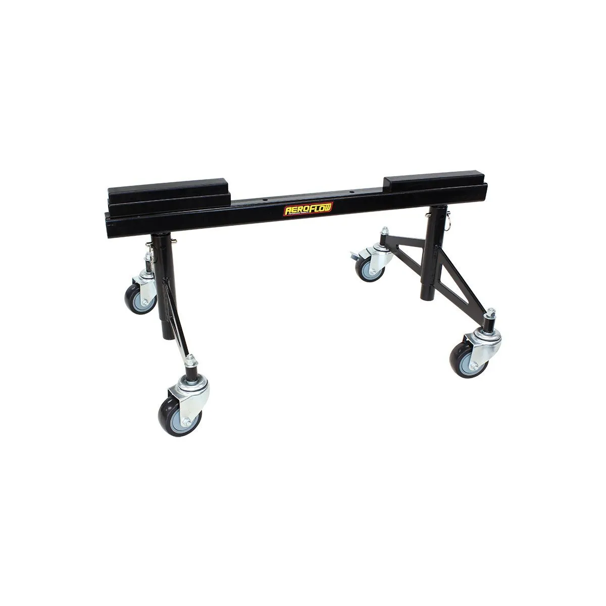 Aeroflow’s black power coated chassis frame stands are robust and strong to get your race car in the perfect position to work on and features a removable 25mm (1”) x 25mm (1”) block for raised chassis rails. Heavy duty 360-dergee caster wheels make moving your race car around the workshop easy.  With two of these castors on each stand featuring a brake to prevent the vehicle from rolling when working on it. Robust construction means it won’t buckle under high load capacity, with each stand having a load rating to 340kg (750lb). The chassis frame stand is collapsible to lay flat for easy storage when not in use.  All chassis stands are sold individually and have an overall width of 762mm (30”).