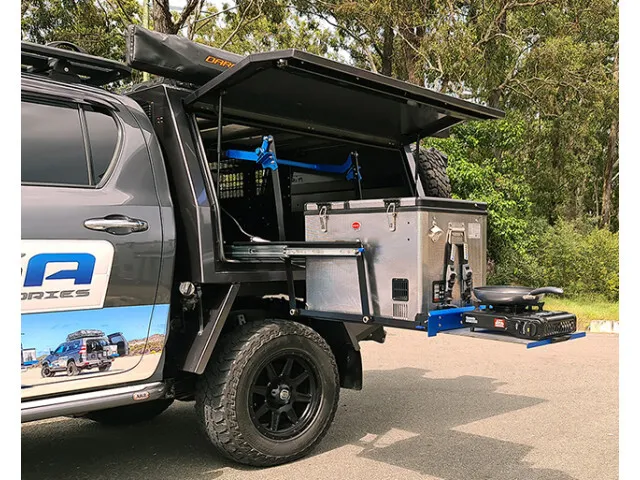 Perfect for preparing a quick meal for the family when on the road. The Drop Slide™ lowers 30 centimetres while extending over the tailgate of the vehicle, allowing easy access to a fridge, toolbox or generator. The slide remains in a horizontal position when lowing, avoiding any contact with the vehicle. The Drop Slide™ with Table features the unique, easily recognisable, MSA 4X4 blue anodised faceplate. Creating a tough, durable and sleek finish, it is sure to stand out from its competitors. The Slide also has a powder-coated steel frame construction for more durability when in use. The lock-in, lock-out safety feature locks the slide in its intended position while travelling, preventing potential damage to the fridge and vehicle.