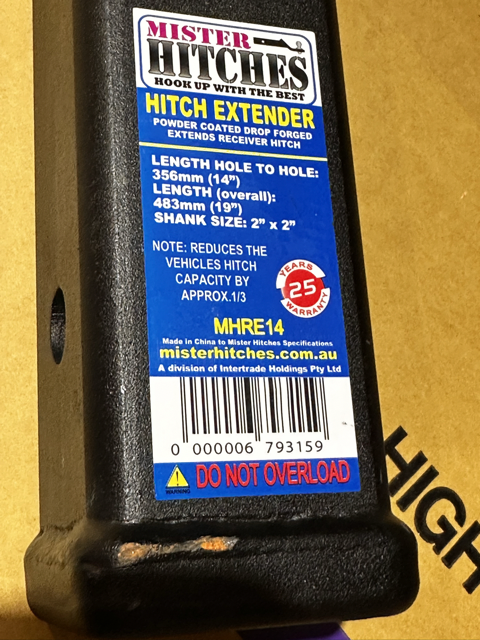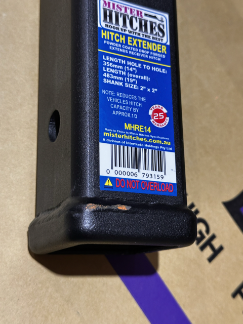 One of the most popular of the non-traditional style range for 4WD’ers is the MH-RE14 Hitch Extender. The Roadsafe Hitch Extender is designed to suit for 2”x2” receivers, and is used to space out mainly bike carriers so they can mount clearing the rear mounted spare tyre. Please note the carrying capacity of the device is reduced by approx. 1/3 when using the hitch extender. Length between holes is 356mm. Total length is 483mm.