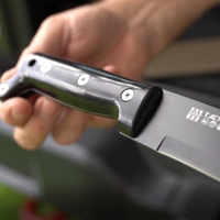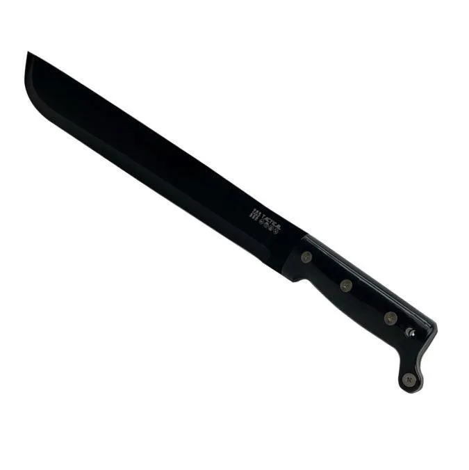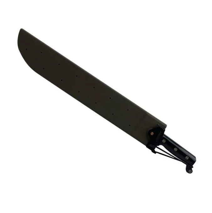 The Bush Machete blade is made from 420 dropforged stainless steel, 46cm long with an overall length of 60cm and full tang. The handle is made of high impact shatterproof polymer with three rivets through the full tang blade.